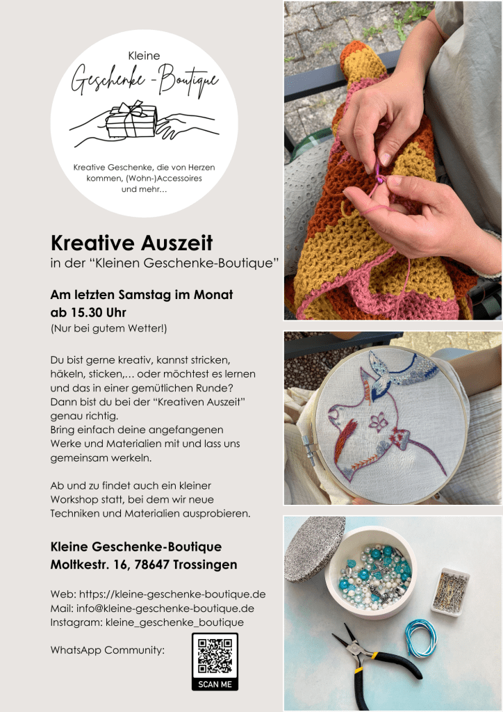 Apropos selbst kreativ werden, wenn du auch gerne werkelst, egal ob nähen, häkeln, stricken, sticken, Schmuck oder Kerzen gestalten…, dann ist die dritte Gruppe „Kreative Auszeit“ vielleicht etwas für dich. Momentan hat die Kreative Auszeit zwar Winterpause, aber sobald es wieder wärmer wird und wir draußen gemütlich sitzen können, treffen wir uns immer am letzten Samstag im Monat in einer geselligen Runde, um gemeinsam zu werkeln. Dabei spielt es keine Rolle, ob du kompletter Anfänger bist und eine neue Technik lernen möchtest, schon fortgeschritten oder sogar Profi, bei uns ist jeder, der Freude am Kreativsein hat, willkommen. Genauere Infos zu den Themen und Terminen gibt es in dieser Gruppe.